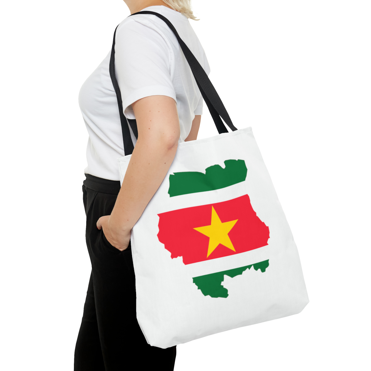Omarm de levendige Surinaamse cultuur met onze unieke tas. Deze veelzijdige tas is doordrenkt met de rijke kleuren en symbolen die de diversiteit van Suriname weerspiegelen. Het duurzame materiaal en de ruime binnenkant maken het perfect voor dagelijks gebruik, of je nu boodschappen doet of naar het strand gaat. Met zijn opvallende ontwerp, geïnspireerd door Surinaamse kunst en patronen, brengt deze tas een vleugje exotisme en stijlvolle functionaliteit in jouw dagelijkse avonturen. Draag jouw liefde voor Surinaamse erfgoed met trots met deze prachtige tas!